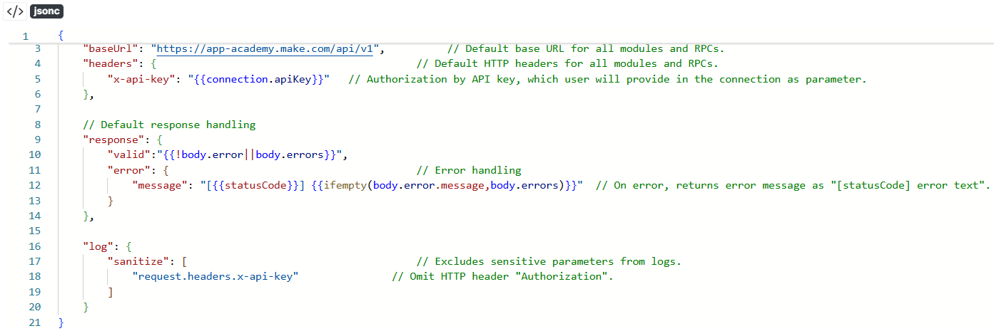 Try your setting up an own application at Make.com, and see provided links [1, 2, 3, 4]. Make DevTool extension additionally supports the app development.
